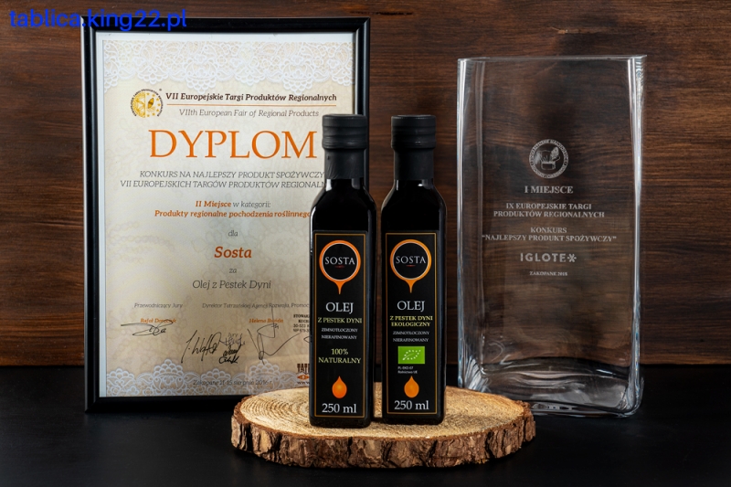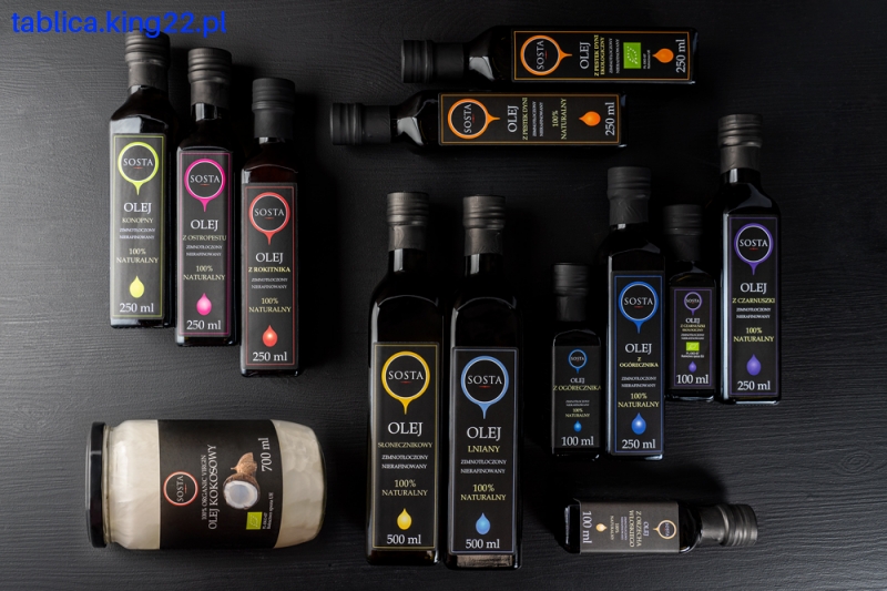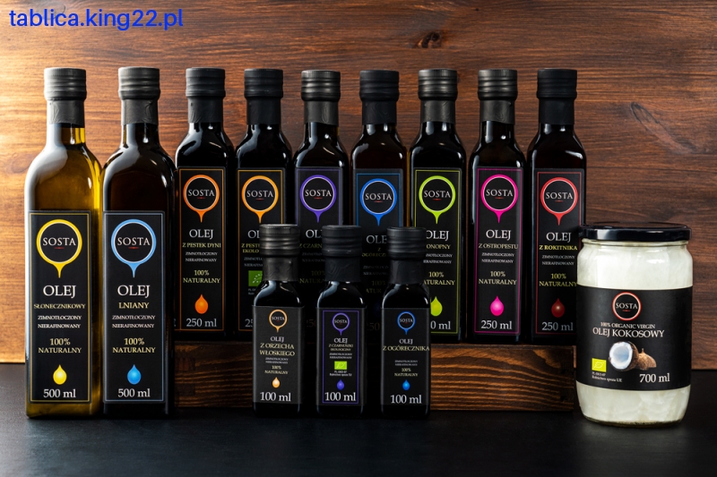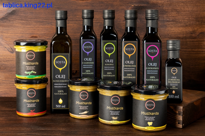 Firma SOSTA zajmuje się sprzedażą najwyższej jakości olejów spożywczych tłoczonych na zimno, masła klarowanego, musztard i octów. Jestesmy doświadczoną firmą, w branży od wielu lat, jesteśmy równiez członkiem stowarzyszenia Polska Ekologia, naszą specjalnościa są oleje spożywcze premium z najwyzszej jakości składników bio pochodzenia polskiego oraz zawsze świeże, bo tłoczone na Państwa zamówienie. W naszej ofercie znajduje się ogromny wybór produktów bio takich jak: olej kokosowy, olej konopny, olej lniany, olej rzepakowy, olej sezamowy, olej słonecznikowy, z czarnuszki, z gorczycy, oleje z orzechów oraz mnogość innych produktów klasy premium. Gwarantujemy najwyzszą jakość zarówno składników z których wykonujemy nasze produkty, jak i wszystkich naszych produktów. O jakości naszych produktów premium przekonało się już wielu zadowolonych klientów.